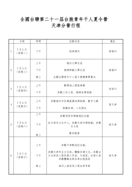 各位朋友好,由全國台聯主辦,天津市台聯及澳台青年交流促進會聯合承辦的共訪首都經濟圈·感受悠久文化歷史2024台灣青年福建天津北京交流團,將於2024年7月2日至11日舉行,活動將組織台灣青年走訪北京、天津及福建省。
