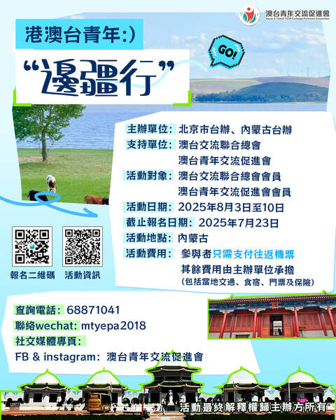 由北京市台辦、內蒙古台辦主辦,澳台交流聯合總會、澳台青年交流促進會承辦的 【港澳台青年“邊疆行”】 交流參訪活動,將於2025年8月3日至10日舉行!誠摯邀請台灣青年朋友一同參與,共探北疆壯美風光與深厚文化!