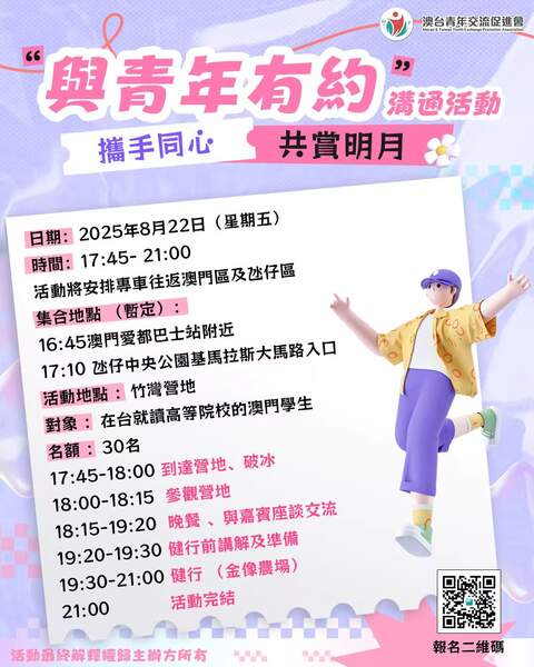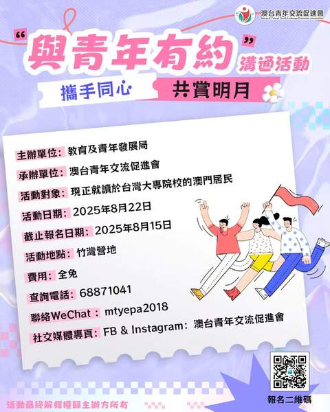 由教青局主辦、澳台青年交流促進會承辦的“與⻘年有約”溝通活動 — “携⼿同⼼ • 共賞明⽉”將於2025年8月22日舉行!