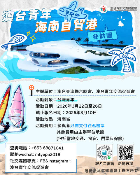 由澳台交流聯合總會、澳台青年交流促進會主辦的澳台青年海南自貿港參訪團,將於2026年3月22日至26日舉行!誠摯邀請台灣青年朋友一同參與!